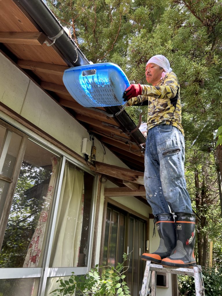 杉林に囲まれた立地のため、杉の枯葉が樋に大量に溜まり、雨水が溢れてしまう状態でした。